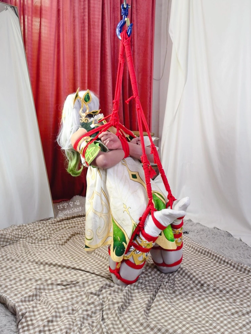 外出的纳西妲又一次被抓获了,这回迎接她的依旧是密密麻麻的绳子……他们将她的大小腿捆在了一起,双手在身后被吊到了几乎极限高度,让她痛苦不堪,这还远远不够,他们又将她的双腿和上半身连接到了一起,然后将整个身子吊了起来,让她只能够膝盖踮地……在蒙上眼睛带上开口器和震动小玩具后他们便离开了,只剩下无助的小草神不停地扭动着身体……