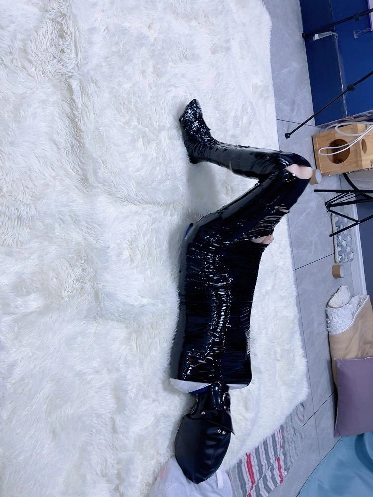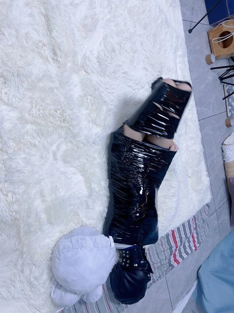 不过既然茶茶大言不惭,挑战一定是要有点危机感的:木乃伊全包之后脖子上还要带上强制抬头项圈,固定脖子的同时还能限制呼吸。然后头套里也套上两层丝袜、带上鼻夹后补一个呼吸限制皮革全包头套。