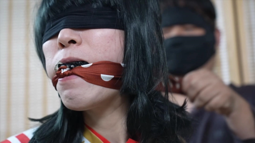 1:先把丝巾塞进嗷嗷的嘴巴里,然后再用两根细的丝巾勒住嘴巴,最后再覆盖上两层的丝巾,用来严密堵嘴