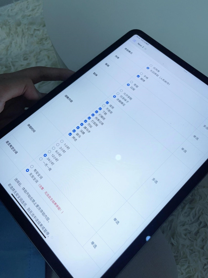 妹子根据自己的需求填写表格,令我惊讶的是妹子居然选择了最严厉的24小时体验,并且经过反复确认还是选择了无安全词。(填表结果在图片里)