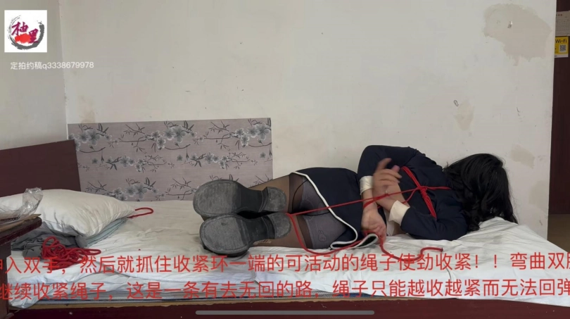 然后再用十米的麻绳捆住膝盖上方,纵向收紧。把带有两个钥匙圈的收紧环固定到脚踝的绳子上,方便之后进行驷马自缚。裁剪一段差不多长度的绳子,一端做一个收紧套方便用来束缚双手。背上大的绳套,把那一段绳子穿入收紧套,再另一端穿过背后的绳套上面的一段。深入双手,然后就抓住收紧环一端的可活动的绳子使劲收紧!!弯曲双腿继续收紧绳子,这是一条有去无回的路,绳子只能越收越紧而无法回弹。