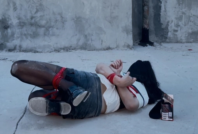 绑好后我实在是跪不住了也蹲不住了,双腿实在是太累了,就倒在了地上,结果整个人都被地面上的灰尘给沾满了!!!!