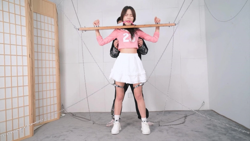 这个红色的足球宝贝的衣服本来是上衣加短裤,言妍自己搭配了一件学生气质的百褶裙,她这样一搭配,穿在她身上毫无违和感,加上白棉袜和加绒的运动鞋,这气质立马就出来了,把木枷吊起,腿上用了大腿铐,脚铐也用两根铁链限定了活动范围,言妍只能很小范围活动身体,这样放置简直太养眼了,经过TK、刺轮和电击器的攻击,她的呻吟声也激发出来了,对,就是我们喜欢的那个调调,又是声画俱美的片子!