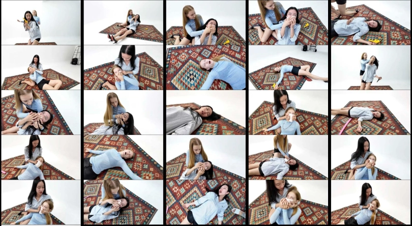 Ari (Asian) and Lizy knock each other out multiple times using chloroform while walking in high heels