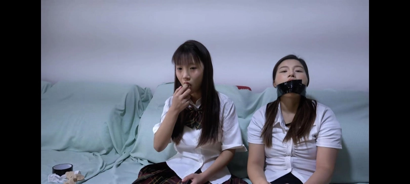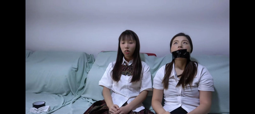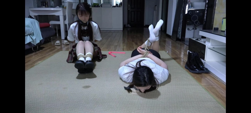 劫匪进门,威胁沙发上坐着的小芝和小野不要动,劫匪要求小野脱下鞋子和袜子,把两只白袜子慢慢塞进小芝口中,塞满,让小野拿胶带缠住小芝的嘴。劫匪再将四只短肉丝袜,让小野自己塞入嘴中,塞满。然后,劫匪让小野穿上新的白袜子,并穿好鞋子,劫匪再给小野带上口球, 随后将她们两个上身绑个日式。再给小野腿部交叉绑驷马,小芝腿部正常捆两道。