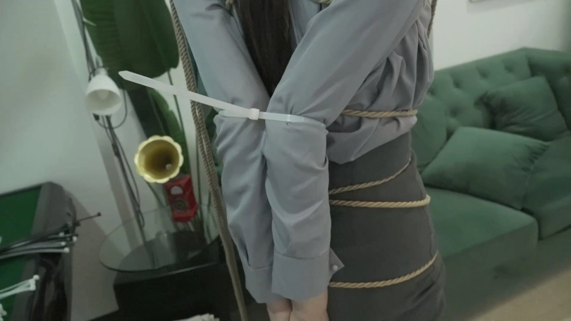挑战1.日式驷马跪缚,将一把钥匙放在丝袜里,把丝袜揉成一团塞进嘴里,再用胶带把嘴巴封起来,思思要在10分钟内用手拿到丝袜中的钥匙,否则任务失败。