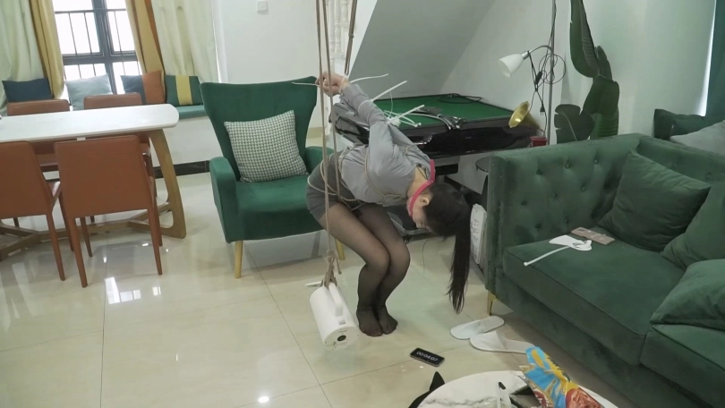 挑战4.五花后高手捆绑,蒙住眼睛,捆住大腿,思思要在10分钟内根据提示词在房间内找到钥匙,否则任务失败。