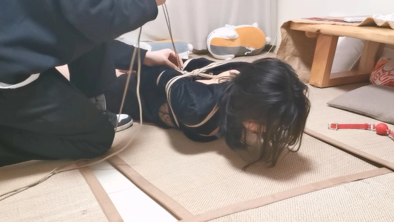 模特身材挺不错,绑起来更性感。这次是两种姿势的放置,一个是跪缚在窗边栏杆上,一个是直臂驷马紧缚,都把模特绑的够呛,还带上了大号口球,最后口球解下来的口水都在榻榻米上流了一大滩了。