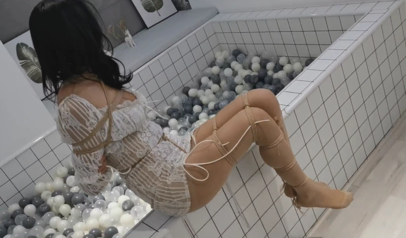 第二幕:镜头一转,梦怡全身已经密密麻麻缠满了绳子。上半身日式,双手紧紧蹿在一起,被绳子捆紧,贴在背上没有一点空间。双腿,被绑了四圈,每一圈都勒紧肉里。嘴把被口球堵住,只能发出一阵阵呜呜的声音。(画外音:天啦,我不会是挑了一个最难的吧,这把我捆的…,全身没有一个地方能动,这…该怎么逃脱呀。)梦怡开始挣扎起来。