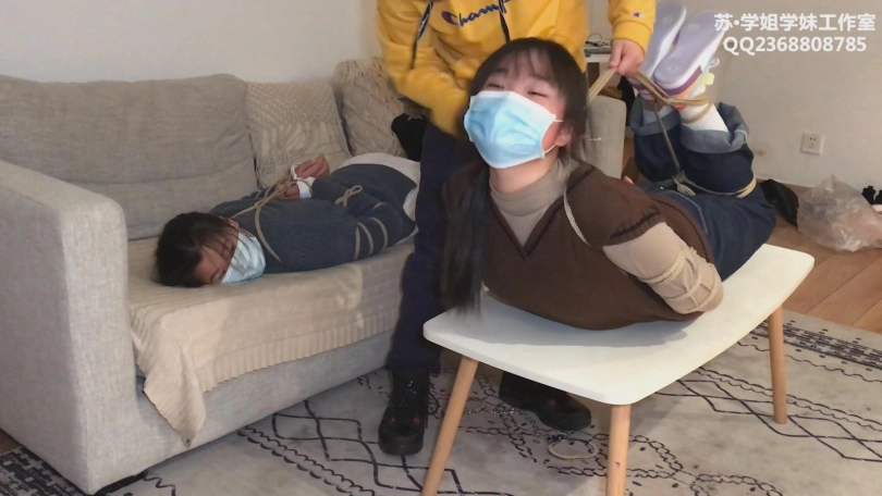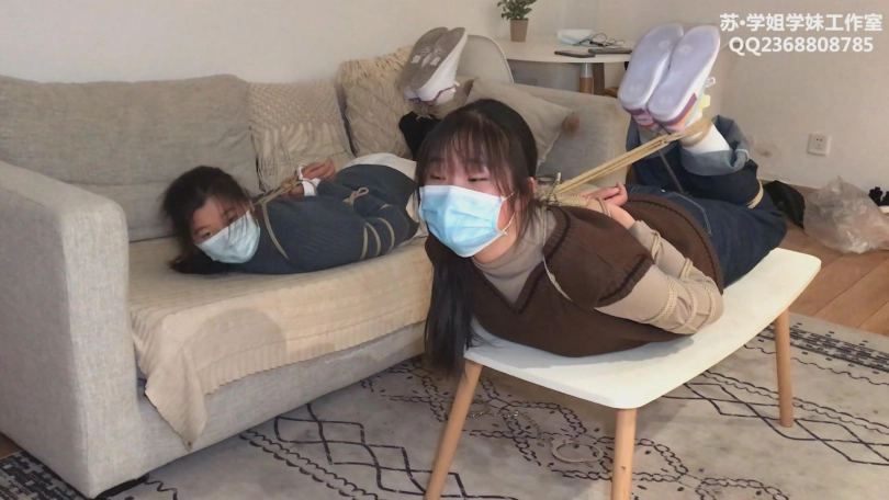 两个可爱的中学生小姐妹一起来试镜,初次体验捆绑。两人刚来的时候超级紧张,站在门口一直往里望,拉着手不赶进来。进来一套五花之后,两人都放松了下来,开始坐在一起被绑着聊天。其中一个练过舞蹈,柔韧性超好,极限驷马不在话下。另一个小时候玩过家人的手铐,把小伙伴铐起来结果解不开了,还被大人打了一顿。五花+超紧驷马+戴镣下跪+戴镣行走,白鞋白袜。(耐克空军板鞋和阿迪stan smith)