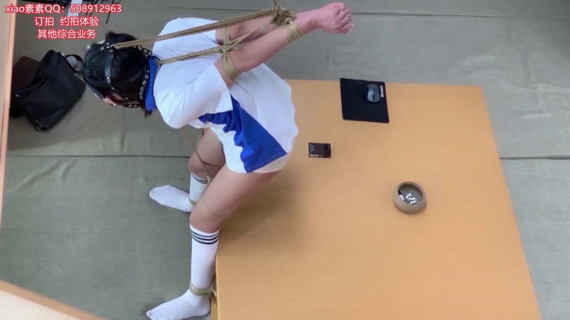 最后一集,此集大叔将难度提升,欧式束缚连着马型口球强制头抬着,双脚固定在桌脚,这样就已经是很难受了,还不算完,之后肩膀固定一根绳子