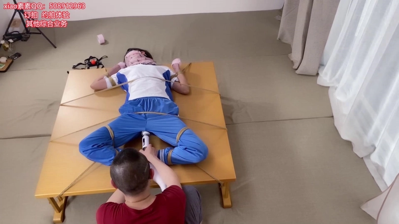 此时的xiao素素已经被完完全全的束缚好动不了,xiao素素想叫,被大叔用大号的马型口球堵上嘴巴 蒙上眼睛的xiao素素嘴巴不能说好,全身被固定更