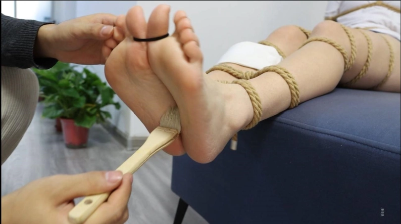 觉醒本性的许斌开始了对珊珊细嫩敏感脚底的TK折磨,被袜子蒙住双眼令珊珊对脚底的感触更加敏感,无论是隔着脏脏的白棉袜挠痒,还是脱掉袜子后用小刷子搔弄裸足,珊珊都只能在浑身拘束中忍耐着,甚至连脚趾都被扎带捆在一起,笑却笑不出声,只得用呜呜声去抗议。最终,被驷马放置的珊珊就这样度过了难忘的一晚。