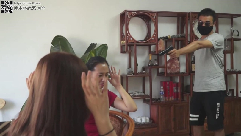 然后劫匪小白站起来拿枪指着莉莉,说:“你俩不要乱喊,喊的话我就开枪了!”莉莉点点头。