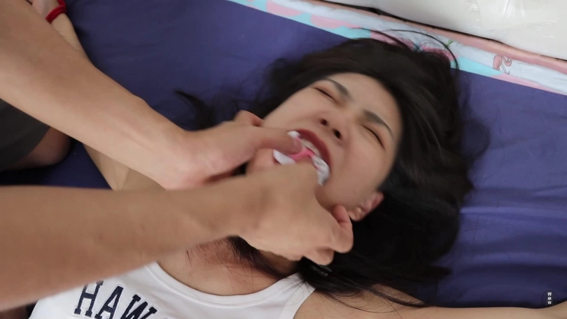 小偷潜入家中盗窃,躲在房间里听到女主人回来后,一不做二不休的把女主人控制捆绑起来。开始,女主人上半身被采取日式紧缚,下半身被股绳加蛇缚紧紧捆绑的靠在墙上,小偷用一块毛巾揉成一团,塞到女主嘴巴里,随后用五张布基胶带将嘴巴牢牢封住,男主为测试女主还能发出多少声音,强迫她呜呜呜地叫喊,见女主只能呜呜呜后,小偷放心,把她靠在墙上了后去翻找财务,女主在墙边挣扎,一会,男主拿来了一个大的长帆布袋,尽管女主不情愿的呜呜可还是被小偷强行塞入帆布袋中,塞入帆布袋打好结后,小偷见女主还乱动,踹了几脚后,又用红色绳子把帆布袋牢牢捆绑住(如图视觉冲击很强)感觉绑结实了,男主继续寻找财务,而女主在袋里挣扎并呜呜呜。一会男主拿着银行卡过来,将女主从帆布袋里放出来,虽然用刀威胁命令她说出密码,女主只好说了密码,随后就被捂晕。镜头一转,已经嘴里戴着口球,身子大字捆绑在床上,努力挣扎。一会男主来了,表示:拿到钱了,但还想玩玩她。随后强行扒了女主的靴子,开始用齿轮,夹子玩弄她。齿轮挠脚心及全身,夹子夹脚趾,让女主痛并快乐着。玩了会,觉得女主喊叫太大声,就脱了她的袜子,用原味堵住她的嘴巴后用银色胶带封上,继续玩弄,直到女主爽为止。一会,男主累了,决定给女主喂些吃的,好戏来了,这里又有耻辱喂食,女主被直臂缚加驷马倒攒蹄捆绑着吃面包很屈辱。不等女主吃完,男主又用刚给她穿上的鞋袜,(被鞋子熏过的袜子堵嘴),原味白棉袜塞入嘴巴后,接着白色绷带缠绕,三块红色布基胶带,三块灰色布基胶带封住,布基胶带封好,又用粉白静电胶带缠绕住,以此女主有口不能言了,难受得呜呜,楚楚可怜。女主挣扎给力不少于四分钟。