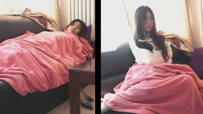 突然,美女醒了过来,原来自己还躺在刚才的沙发上盖着毯子,毯子只把头漏了出来,刚才是梦中梦,自己根本没醒过来,现在才真的醒了过来。