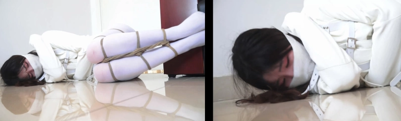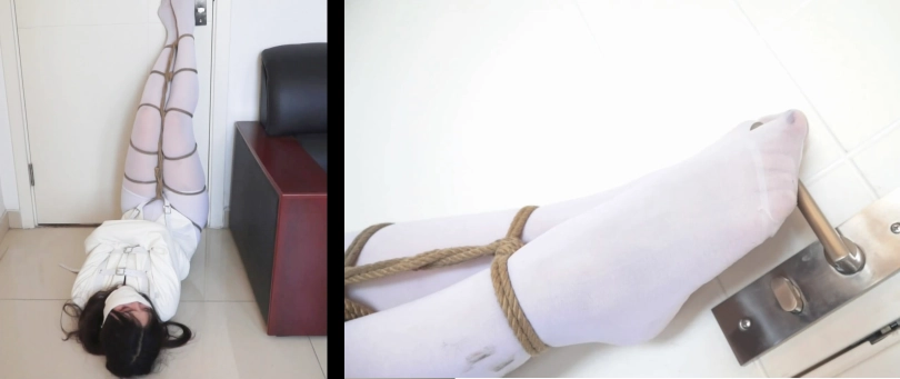 虽然已经被捆绑成了肉段子但是美女明显不肯放弃,因为拘束衣手不能用,所以美女想用白丝美脚打开门把,但可惜,门被锁了,美女根本打不开。