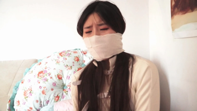 美女又挣扎一番,想把手从身后拿出来,但被头卡住,根本拿不出来。可怜的美女根本完全无法挣脱。