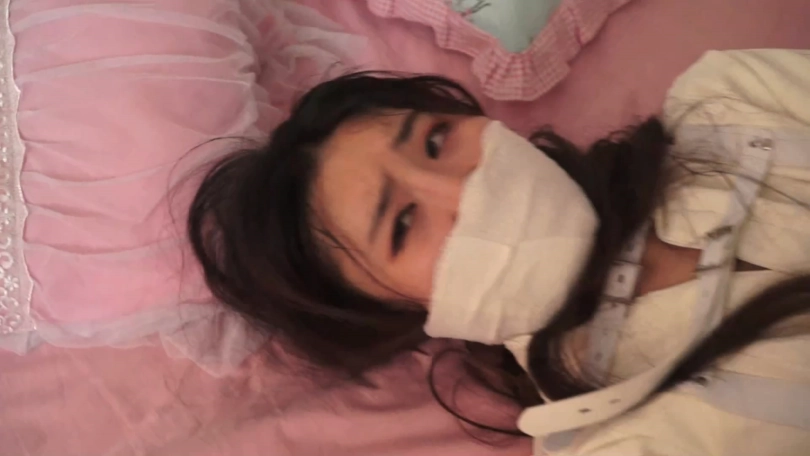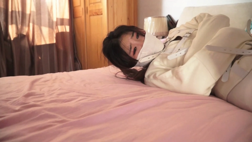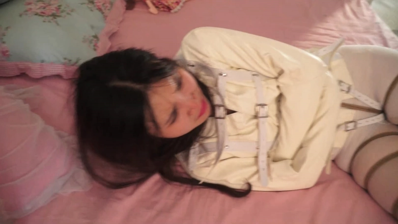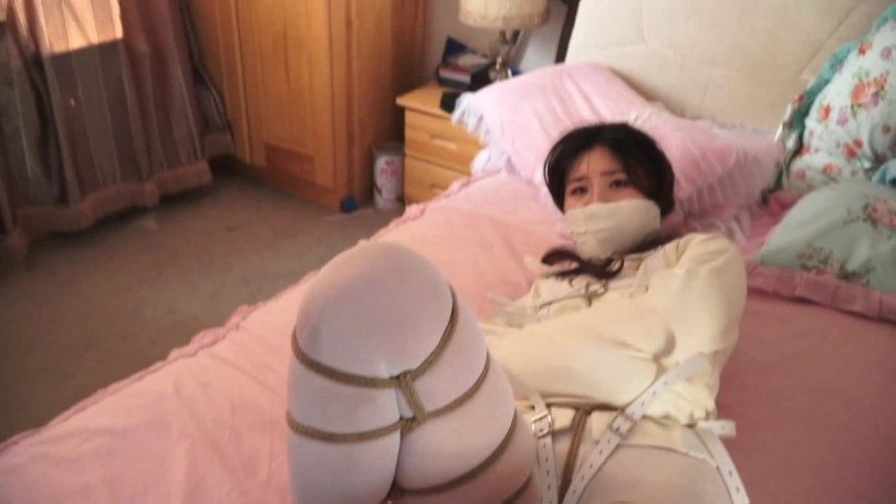 被医生关押了1个月的美女已经被放在床上生活了,她的白丝美腿被分开折叠捆绑起来,现在她完全像个白色团子,根本无法自由活动。