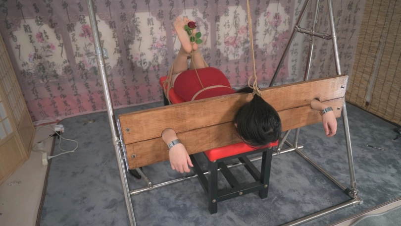 情人节设计的游戏,妹子穿了短裙丝袜和高跟,让她趴在凳子上,木枷固定头和双手,双脚翻折用绳子捆得牢牢地,用玫瑰花杆TK特别应景,妹子不断扭动身体却无能为力。