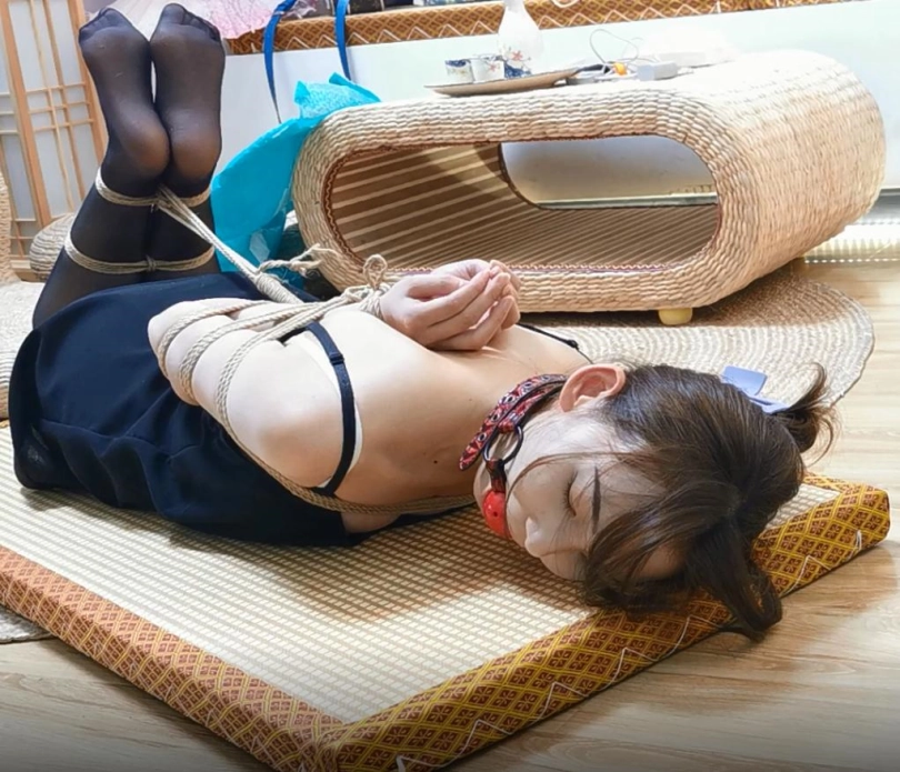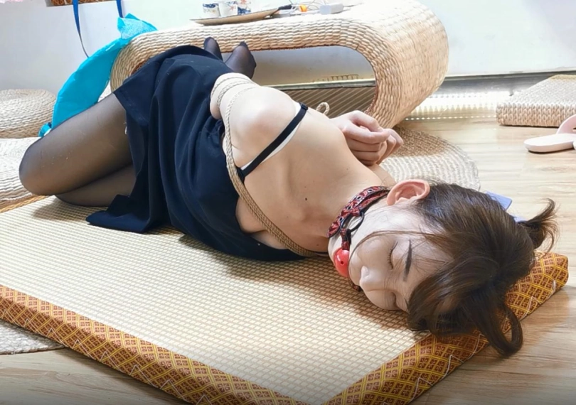 模特果果,后手观音,驷马,吊带裙黑丝,戴着口球,模样惹人怜惜。