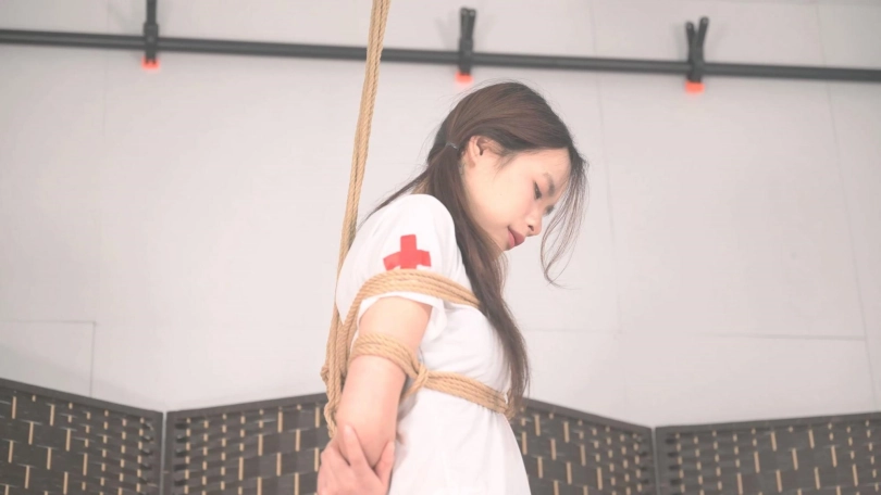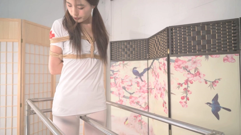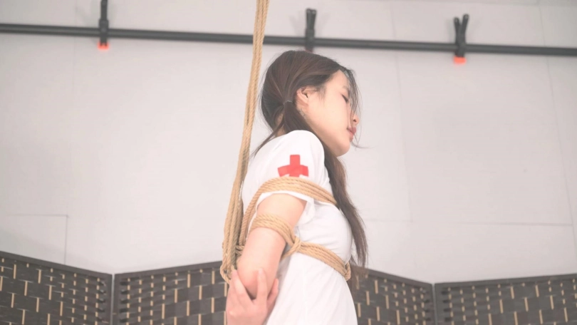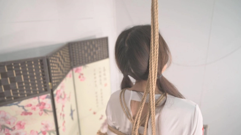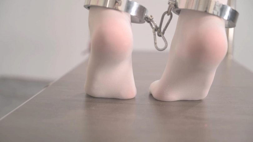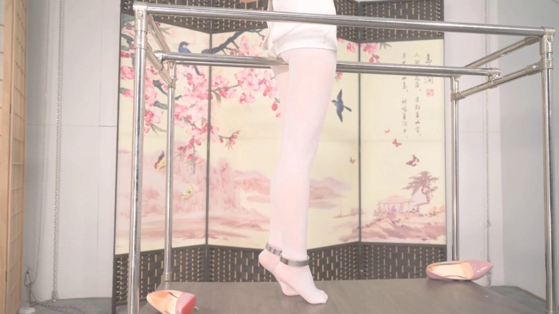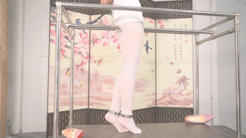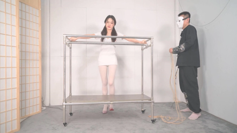 妹子虽然很早做过绳模,但是接触绳艺较多,今天是第一次领教我设计的铁架装置,当她穿上高跟鞋站上去很轻松,钢管的恰好卡在那个位置,上身是日式小高手缚,绳子吊上去但不拉紧,这样她可以来回走动,方便下一步行动,脚上铐上链条很短的脚铐,让她既能走动又不能迈腿逃脱。最爱的就是第一次尝试的妹子,当脱掉她高跟鞋的那一刻,让她瞬间感受到,上也不行下也不得的囧境,她必须保持脚尖踮起,不然就会深深坐到木马单杠上,伤害更大。为了进一步提升难度,不断给她挠痒,特别是挠她的脚底,就为让她站不住,更狠的是,用电击器驱赶她来回走动,而且是踮起脚走,女神般的妹子哪受过这罪。八十多斤的妹子,修长的美腿,站在架子上受刑,画面却美不胜收。