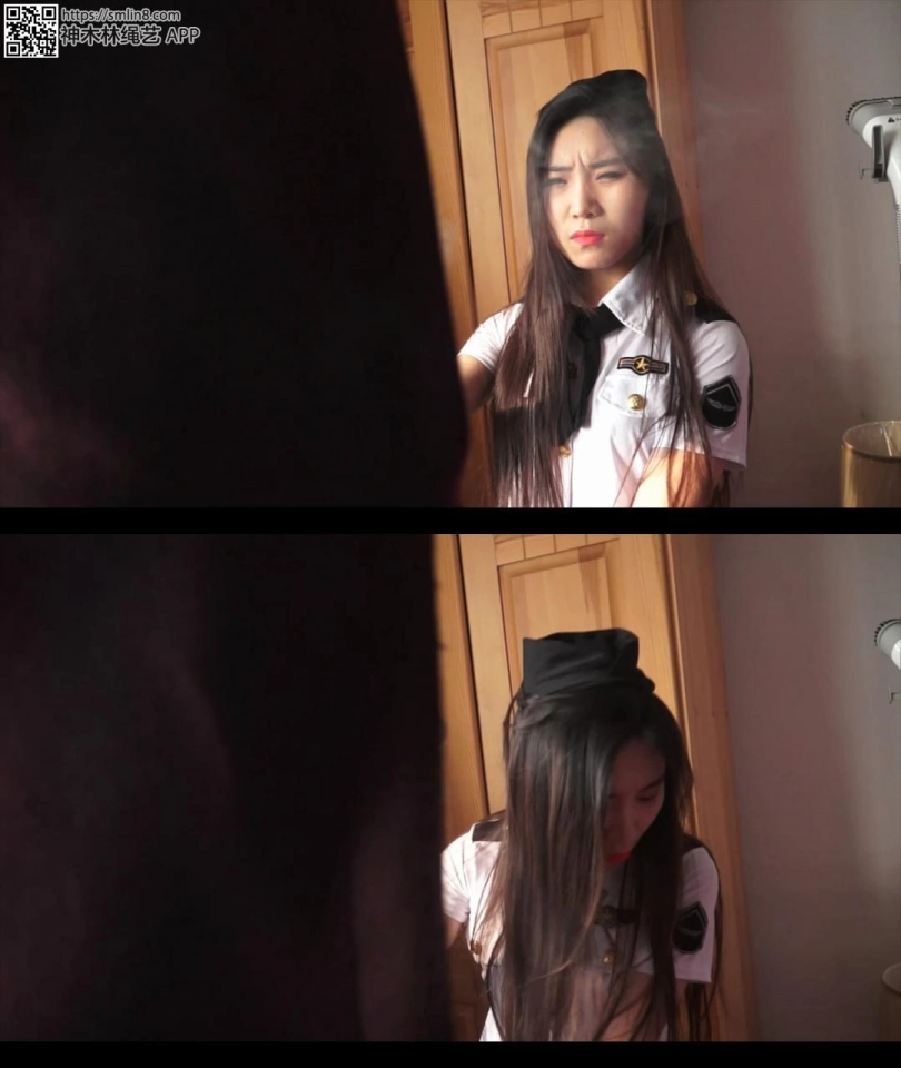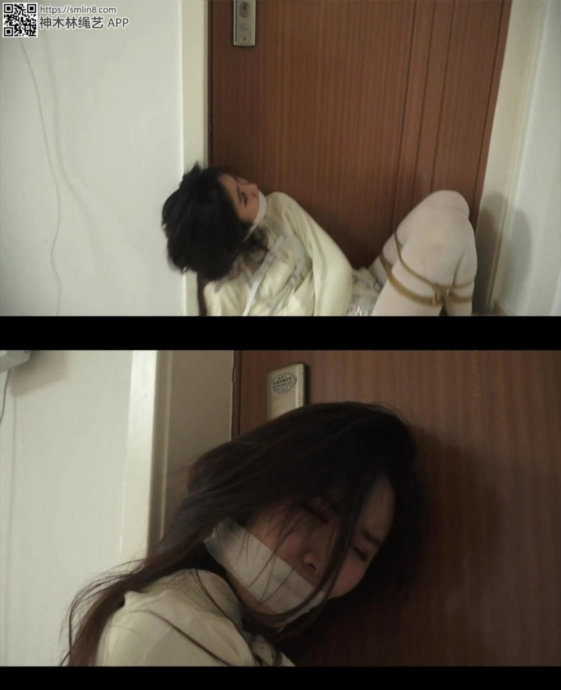 女警想用白丝美脚够门把手,但丝袜美腿是被折叠合并捆绑的,她根本无法够到门把。