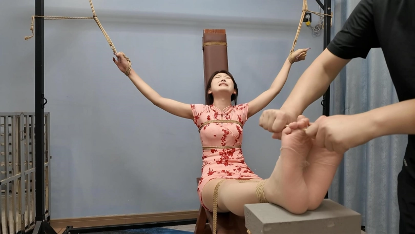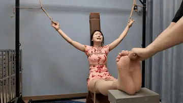 晓琴被绑到老虎凳上审问,六块砖都没有屈服,撕开丝袜。露出脚趾,用筷子夹,疼的晓琴惨叫连连。