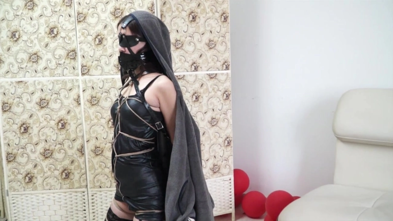 并且戴上马具型的口球,固定在架子后面