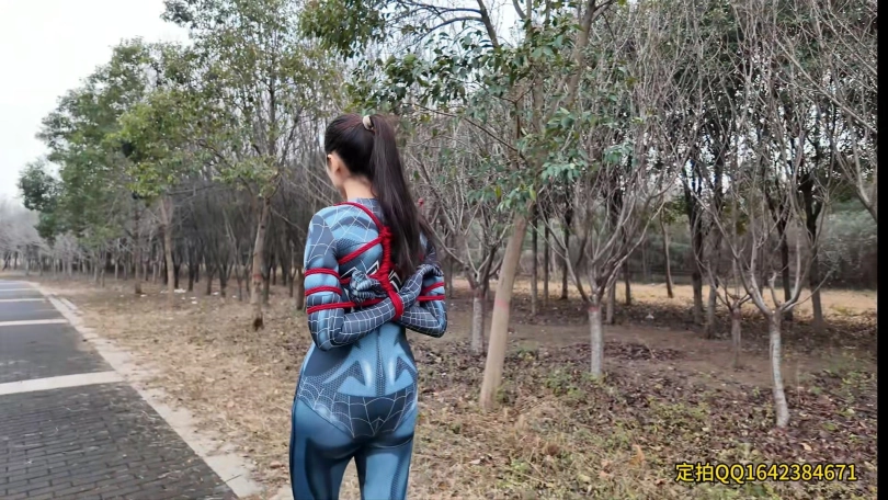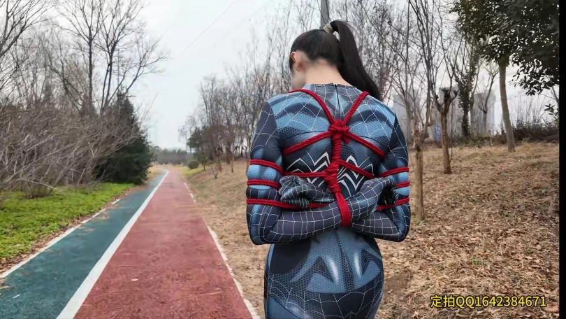 佳佳女蜘蛛装扮,户外散步行走,第一次拍户外题材,佳佳和我内心还是非常紧张的,找了个绿化带,冬天的户外还是很冷的,佳佳非常敬业,五花大绑,不愧之前做过模特队长,走路还是标准的模特步,身段更显优美