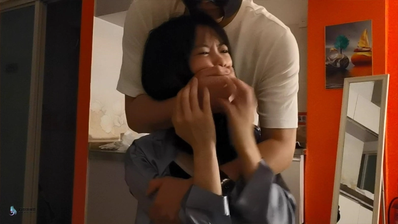 镜头⼀转,⼥主还是安静地坐在原来的凳⼦上,只不过以⼀个不同的姿势。她的双臂被牢牢固定在身后,腿被绳索固定成了⼀个⼆郎腿的姿势。⼥主的眼睛已经被眼罩蒙上,惊恐愤怒的她还在质问⽍徒:“混蛋,你到底想要⼲什么?”话还没说完,⼥主的嘴巴就被⼝球赌上。⼥主拼命扭动身体挣扎。⽼⿊将其拖鞋脱下,玩弄其脚掌。