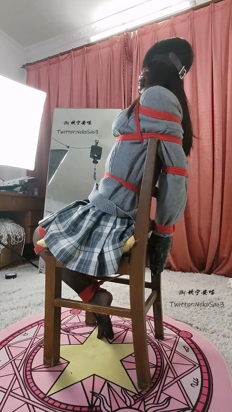 黑丝JK并腿直臂包手固定在椅子上,手脚相连放置
