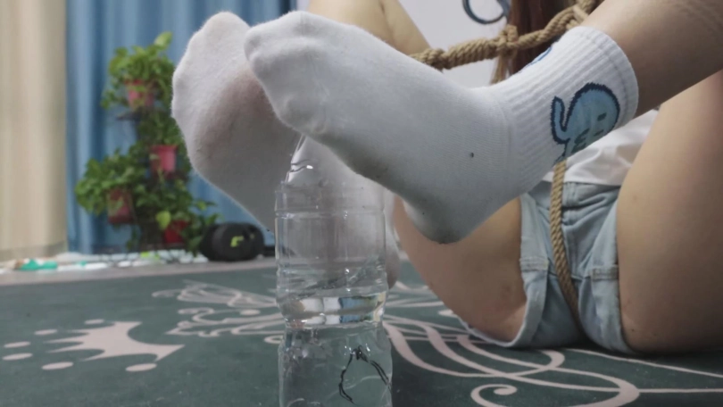 将她的双手和拇指戴上手铐与拇指铐,并且与股绳相连,大小腿拘束起来后当着她的面将手铐钥匙与拇指铐钥匙放入装水的塑料瓶内,告诉她只要她将瓶盖打开,将钥匙拿出来便可免除刑期(当然,这是不可能完成的),唯一能活动的只有双脚,可穿着闷脚AJ的她又怎么可能做到呢?于是她乞求管教人员能脱掉她曾经无比不愿意脱掉的鞋子。