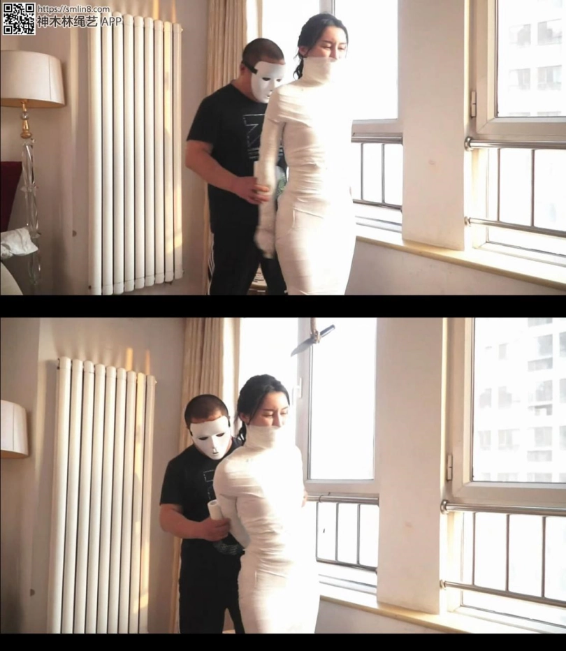 经过费力艰难的挣扎,白色木乃伊美女终于把腰部的绷带挣扎松了。