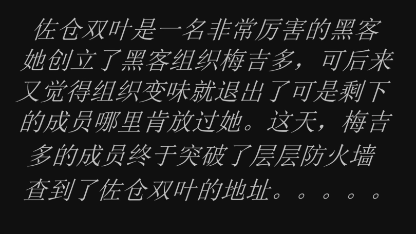 佐仓双叶(吴晗饰演)是一名非常厉害的黑客,她创立了黑客组织梅吉多,可后来又觉的组织变味就退出了,可是剩下的成员哪里肯放过她。这天,梅吉多的成员终于突破了层层的防火墙,查到了佐仓双叶的地址......