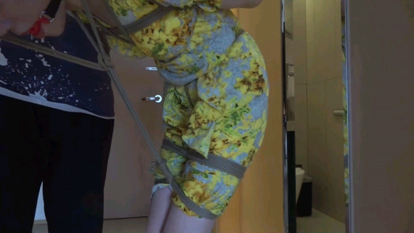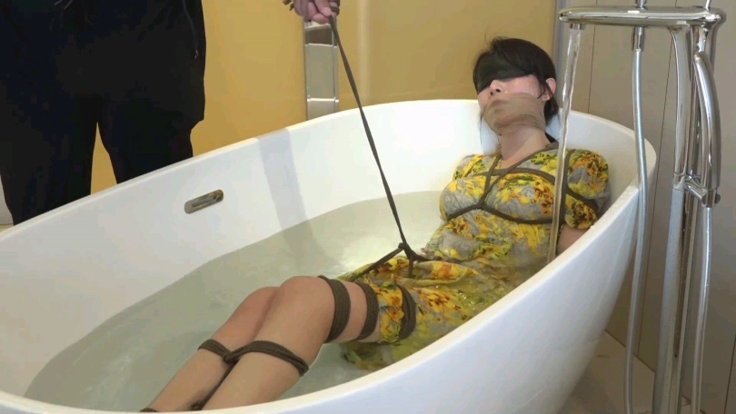 眼镜男觉得只捆绑柳洋还不过瘾,于是将柳洋解开束缚,重新绑好后牵着柳洋来到一家带有浴室的旅馆,一边牵拉着柳洋一边拍着她的屁股向浴室走去。来到浴室后,柳洋已经被加固束缚,并且嘴部的口球换成了丝袜。这可把柳洋难受的不清,被戴上眼罩,外面什么也看不清,只能任眼镜男玩弄。淋浴一番后,眼镜男将柳洋抱进了浴缸,柳洋无处安放的丝袜美腿到处乱蹬,等水没过柳洋后,眼镜男还假惺惺的使劲拉柳洋的股绳,说是把她提起来,避免被水淹过,而这一举动带给柳洋的只有无尽的快-感。