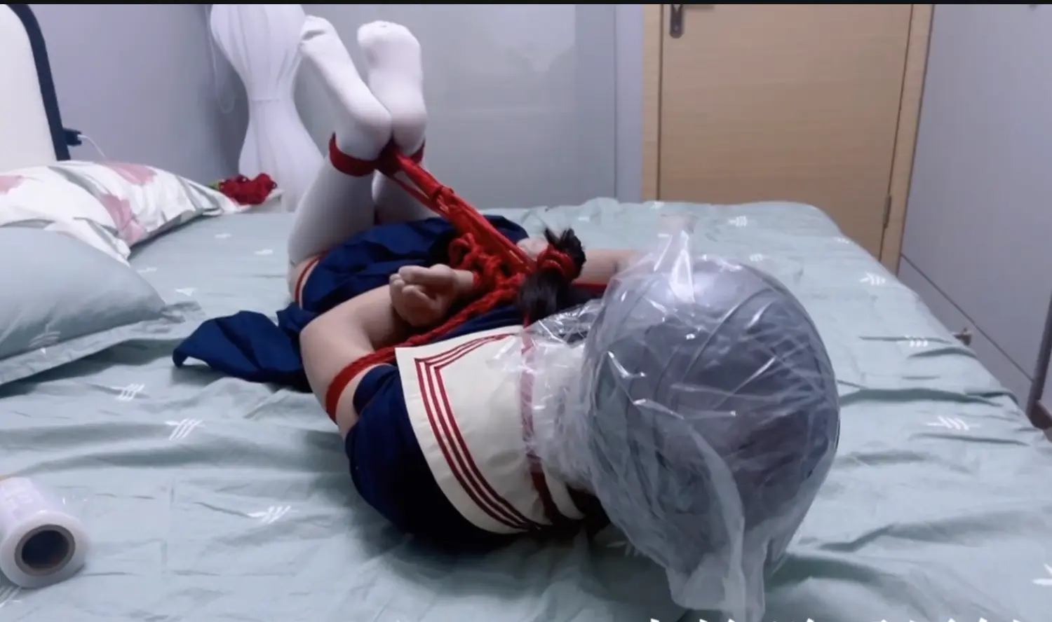 用热缩膜、塑料袋套住脑袋、用胶带封好,同时对脚底进行挠痒,并且用小红SP,鞭打屁股和脚心(下手超级重),注意这一切都是同时进行的!!!还会用手拿着塑料膜捂住妹子的口鼻,TK妹子的白丝脚底、鞭打妹子!