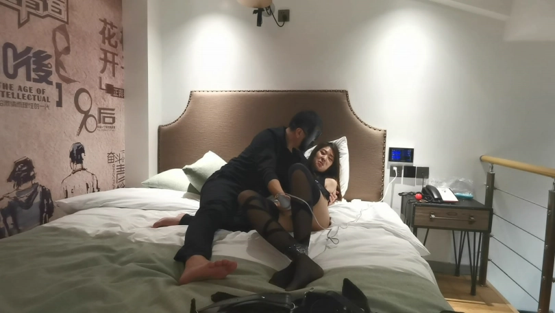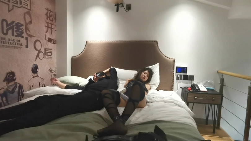 一身性感情趣服,再用胶带捆绑,用棒不断刺激,瑾萱不断呻吟乱动。