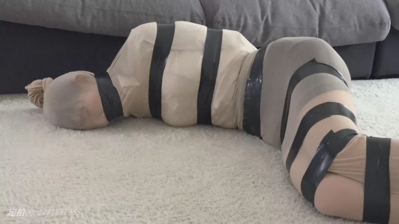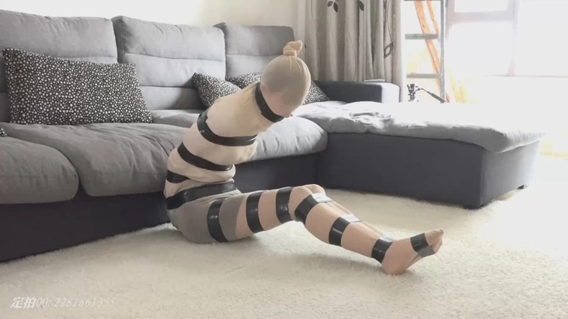 美女琪琪职业装肉丝被胶带捆绑封嘴,呜呜呻吟,满地挣扎。后来又被丝袜睡袋全包,外面用胶带一圈一圈缠上,她无奈的挣扎着。。。。