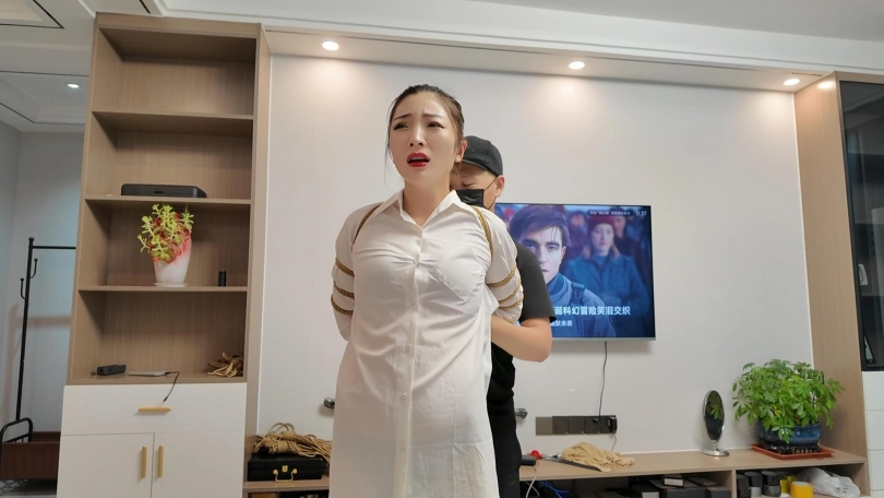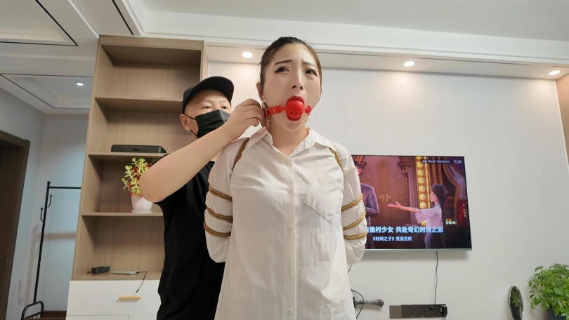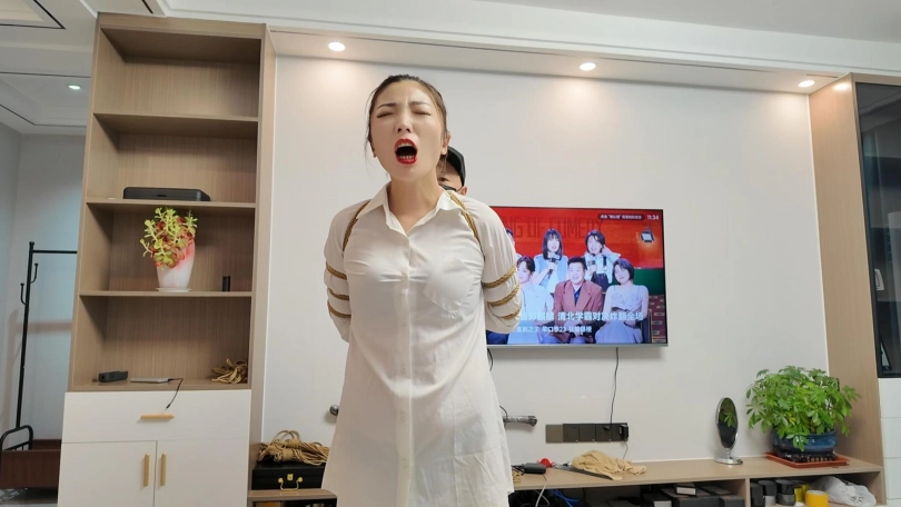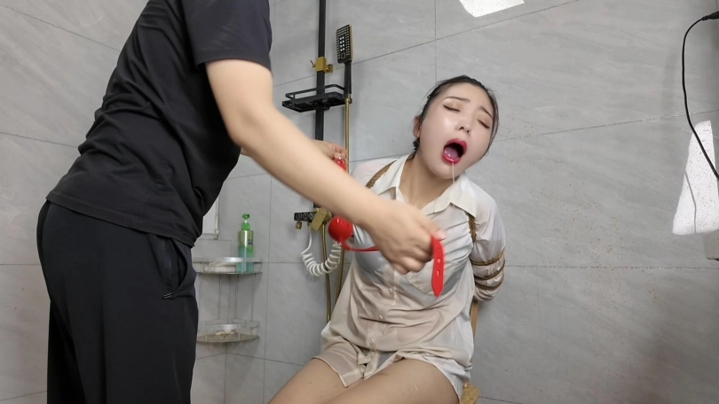 佳佳只穿一件白衬衣,一套黑色内衣,被五花大绑,超大口球堵嘴,摘下的时候干呕不止,带到卫生间,用可乐喷身,强行灌可乐,上演了一部湿身大片