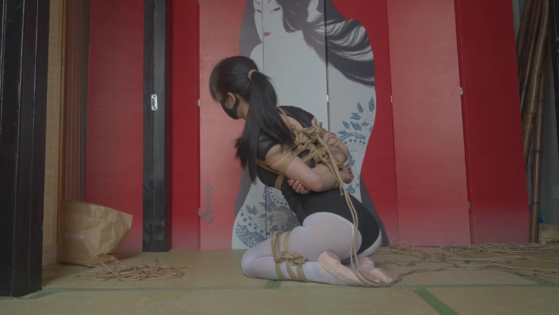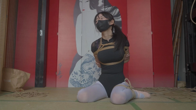 舞蹈生(嗷嗷饰演)来到了教室,并在教室内练习,不料在练习的时候遭遇歹徒,歹徒的面容在阴影中扭曲,身形高大,肌肉线条在昏暗的教室灯光下显得格外狰狞(误)。他手持绳索,眼神中透着暴虐与扭曲的快感。而舞蹈生(嗷嗷饰演)在教室的角落里,身体紧绷,眼神中带着惊恐与不安。她的舞蹈练习被迫中断,取而代之的是这场突如其来的噩梦,随即舞蹈生便被被后手缚捆绑,脚踝也被麻绳所缠绕。随后绑完双手后,歹徒站起身,开始解开缠绕在另一根绳子上的结。歹徒他弯腰拾起绳子,动作显得熟练,显然不是第一次这样做。他先从舞蹈生脚踝处绕了一圈,再绕过膝盖,最终将绳子拉到身体一侧,打了一个死结。歹徒的绑缚过程并不简单。他先用绳子绕过舞蹈生的双手,从背后向上穿过手腕,再用力拉紧。绑的过程中,舞蹈生试图用柔韧性让脚向一侧偏移,稍微缓解绳子的紧绷感,但歹徒似乎察觉到了,又绕了一圈,确保她完全动弹不得。舞蹈生双手被勒得生疼,她下意识地尝试挣扎,但绳子紧绷得几乎没有空隙。最后绑完后,歹徒退后几步,满意地看着自己的“成果”。舞蹈生感觉血液在手腕和脚踝处流动得越来越困难,但她的大脑依然异常清醒。她深吸一口气,试图调整呼吸来平复内心的慌乱。渐渐的,时间开始流逝,伴随着两人沉重的喘息声,只剩下那麻绳在地板上微微颤抖的声音,而就在这时,歹徒拿起麻绳,在天花板的竹竿上开始打起了吊点(吊缚环节不要错过!)