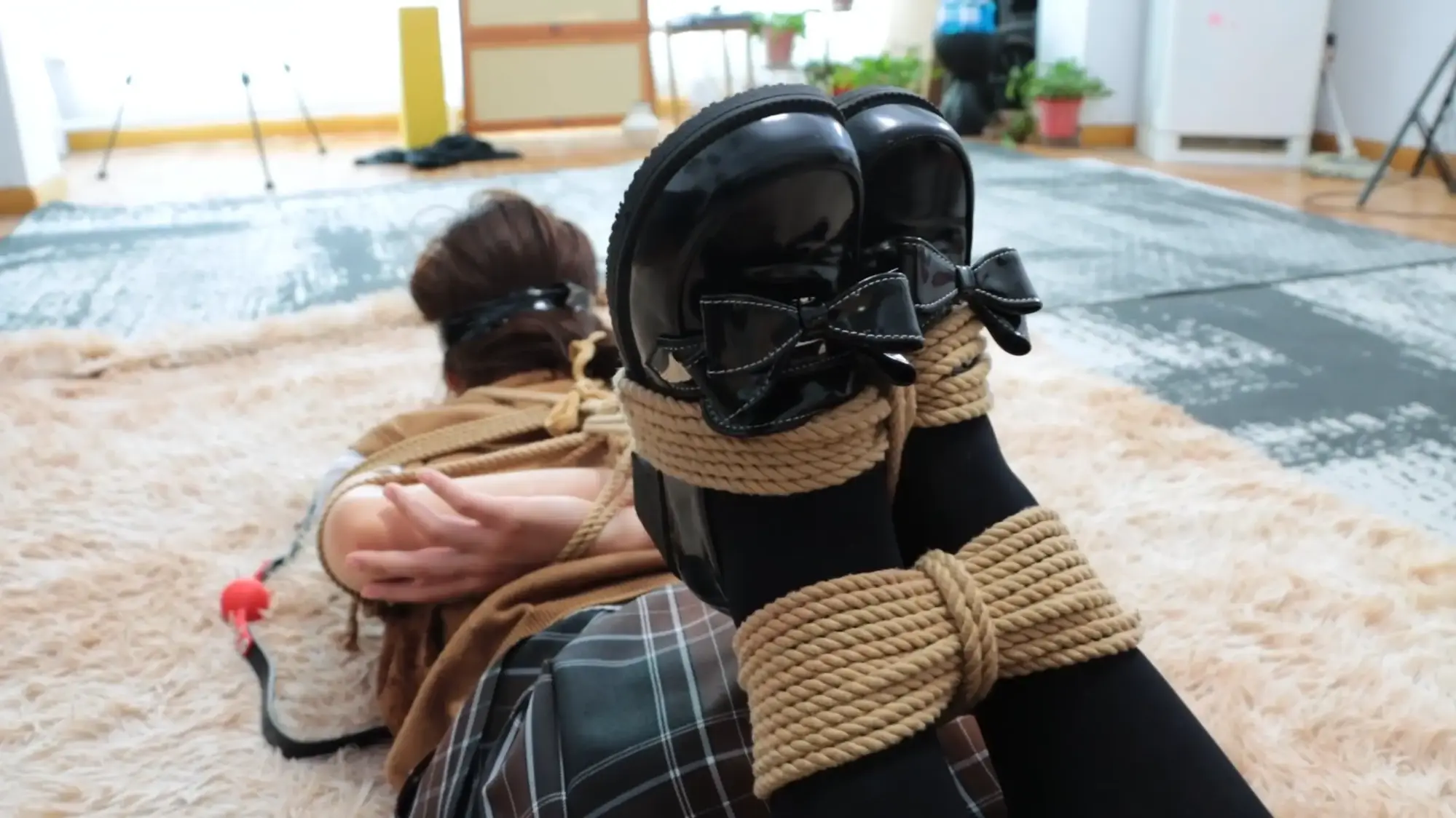 梦尘坐在地上,用绳子将自己的双脚完全并拢中间不留缝隙,然后捆了单股10-12股并在中间收紧,使得脚腕完全紧贴在一起,前后搓动都很困难【梦尘如果自己绑不紧就切个镜头帮她重新绑紧】。捆绑好之后,梦尘伸出绑好的双脚展示给绮娜看,