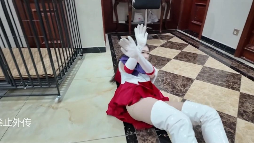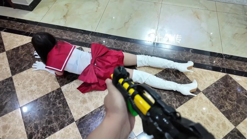 一天,女主因为大雨虚弱,避雨时候碰见员工。员工看见女主虚弱的样子联想起了美少女战士。恶从胆边生,开始折磨女主。女主挣脱开,变身为美少女战士,打得员工屁滚尿流逃走,女战士追击。被员工用水枪击倒,不停的呲水女战士虚弱哀嚎。员工折磨女战士击腹掰腿踩踏脱靴等。折磨过程中丝袜也被撕烂,女战士陷入绝境。员工拽起女战士扔进浴室,喷头呲女战士。女战士能量核心进水,倒下。最后,女主向其他女战士求救,昏死过去。