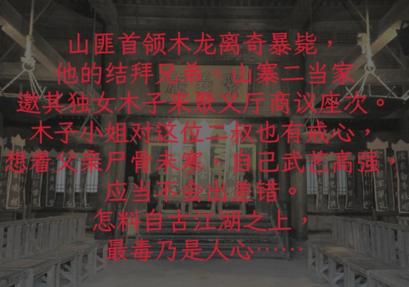 山寨首领木龙离奇暴毙,二当家邀其独女木子来聚义厅商议座次。木子小姐也有戒心,但想着父亲尸骨未寒且自己武艺高强,应当不会出差错。怎料自古江湖之上,最毒乃是人心——那个平日里亲切的二叔,竟然动起了把侄女变成压寨夫人的主意。绳捆索绑之下,木子小姐绝望地发现一切都出自一个黑暗的阴谋……