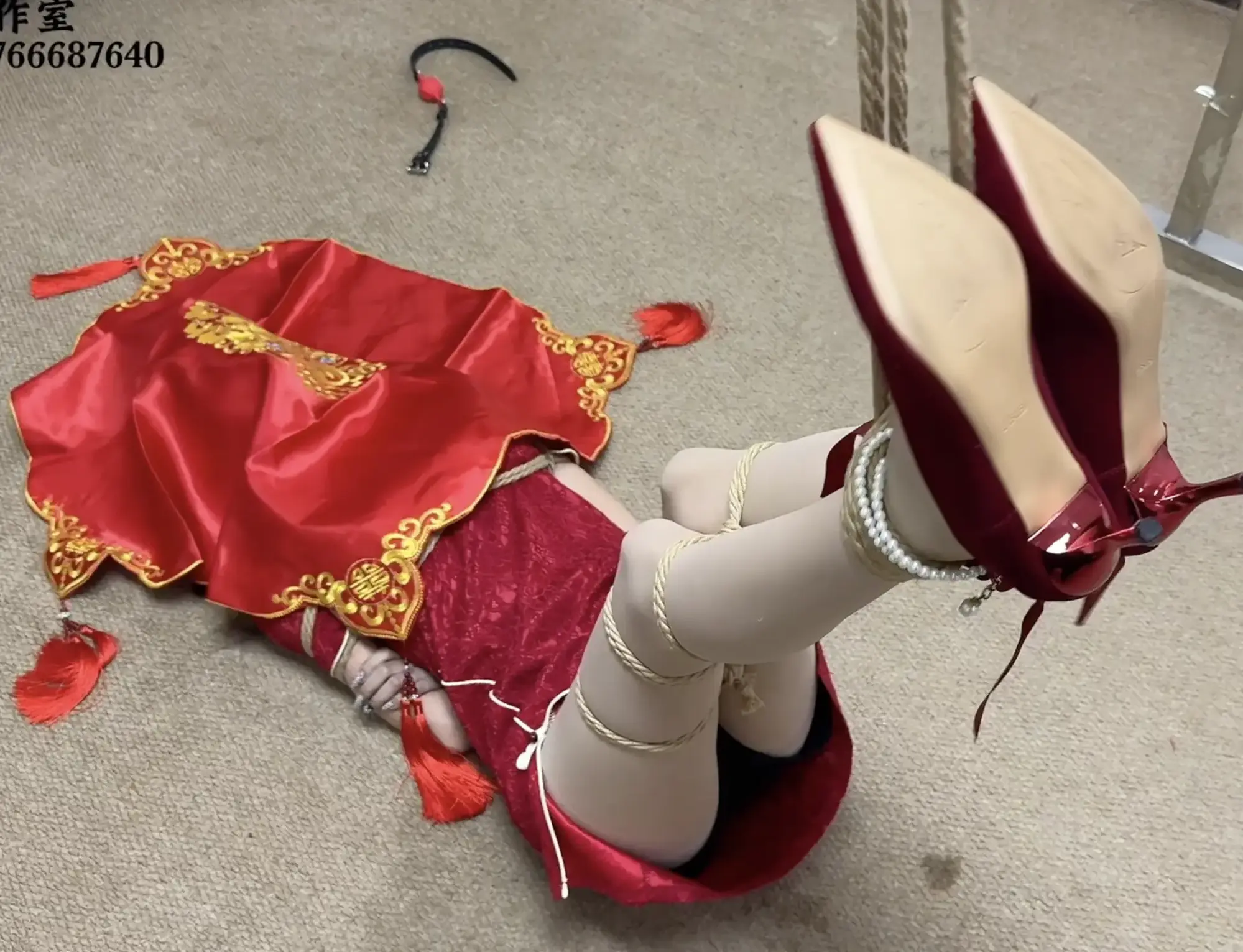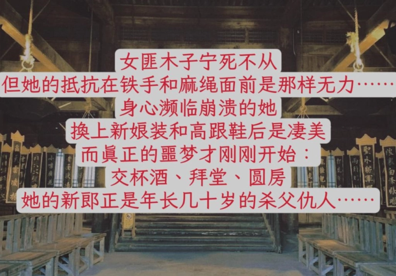 飒爽的女匪小姐木子被扒掉了马甲衬衫长靴换上红色短旗袍和高跟鞋,吊起的双腿、层层的堵嘴、蒙脸的盖头……极致的凄美绝望,而二叔也终于肆无忌惮地伸出魔爪……大红色的婚服和雪白的肌肤被绳索勒出深痕,交杯酒与泪水浸湿了堵嘴的丝袜,细高跟让被缚美腿的挣扎显得更加无力,少女苍白的脸上除了死灰般的屈辱绝望,还有视死如归的坚定,可惜事到如今求生不得求死不能……