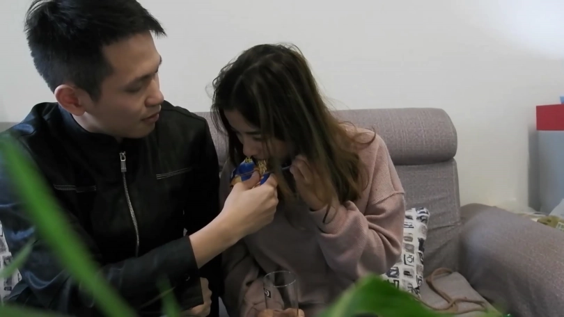 小女孩在家玩手机的过程中,阳台忽然传出动静,却不料背后伸出一只手。