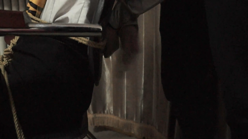 女卧底被捆绑在椅子上绑上爆单,被用枪顶住脑袋,门外传来队长的声音,队长打开门一边说道:“小刘,我们来救你了,你别怕”