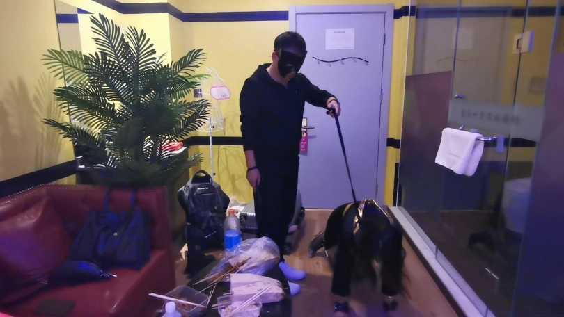瑾萱穿着性感睡衣,黑丝高跟,很是妖娆。带上皮手铐脚铐,命令其趴在地上爬行,并用牵引绳牵引。皮鞭抽打。这也是她第一次尝试狗奴TJ;