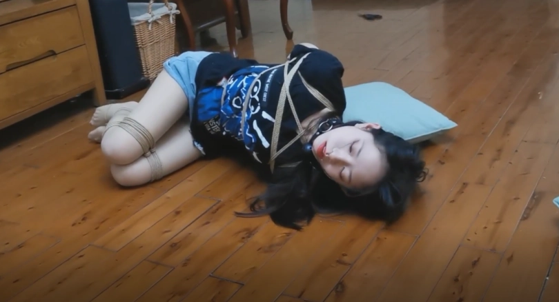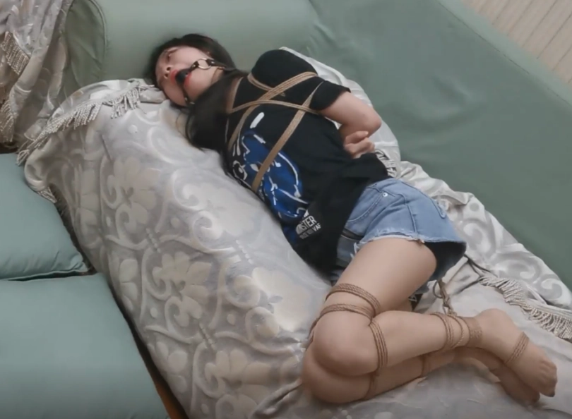 第三幕:珊珊开始疯狂的挣扎了起来。好一会过后,还是不见绳子有任何松动,反而越来越紧了…,(画外音:这是什么绳子,越挣扎越紧,捆的我动弹不得。),突然。梦怡发现不远处的椅子上,有一把剪刀,瞬间喜出望外。疯狂的扭动起来,解开链接自己手脚的绳子后。珊珊从沙发上,挣扎到地上,朝着椅子蹭了过去。拿到剪刀后。珊珊发现,手中的剪刀居然无法解开身上的绳子。口水还在不断的往下流,珊珊逐渐开始虚脱起来,发出一阵呜呜的声音。逐渐睡了过去…